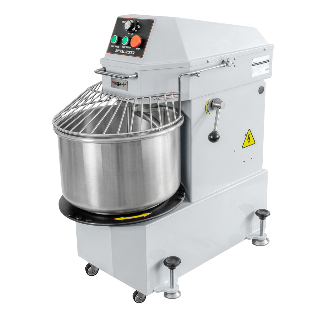 Mieszarka do ciasta Mega-M z podnoszonym hakiem zaprojektowany został z myślą o wymagających użytkownikach branży gastronomicznej i piekarniczej. Umożliwia przygotowanie różnych rodzajów ciasta: drożdżowego, na pierogi, pizzę bez wysiłku. Mikser wyposażony jest w dzieżę ze stali nierdzewnej o pojemności 40 litrów, w której jednorazowo można przygotować, aż 15 kg masy. Spiralne mieszadło ze stali nierdzewnej precyzyjnie łączy składniki gwarantując idealną strukturę ciasta. Urządzenie posiada dwa tryby pracy, ułatwiające wyrobienie składników na ciasto.