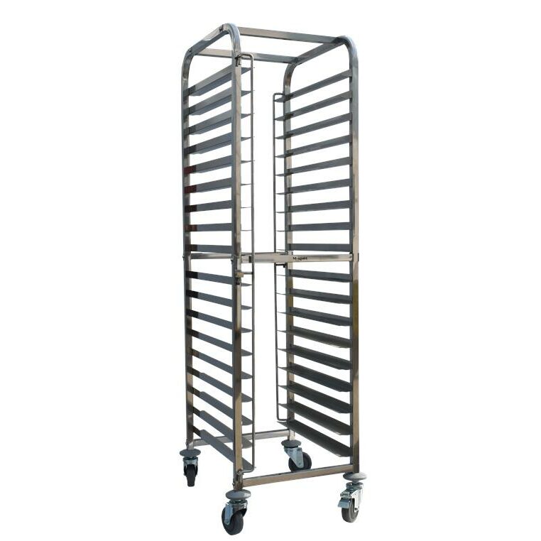 Wózek regał mobilny marki Mega-M to urządzenie stworzone z myślą o profesjonalnym zastosowaniu w gastronomi, barach, restauracjach, sklepach, marketach, piekarniach i cukierniach. Model MM-A200704 wyposażony jest w 18-poziomową prowadnicę mieszczącą 18 blach o maksymalnym obciążeniu sięgającym do 150 kg. Wózek cechuje się otwartą konstrukcją gwarantującą łatwy dostęp do transportowanych tac. Jednocześnie dwie pionowe blokady chronią przed ześlizgnięciem przewożonych tac. Urządzenie posiada 4 kółka o osi skrętu 360° oraz 2 hamulce zapewniające jego stabilność. Dzięki wykonaniu ze stali nierdzewnej wózek wyróżnia się dużą wytrzymałością.